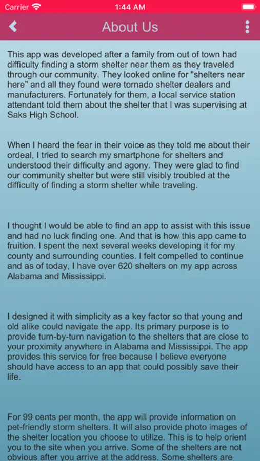 The Free Version provides users in Alabama and Mississippi with a list of storm shelters near the user. The 99 cent version does the same plus provides a photo of the shelter site, the phone number to the local Emergency Management Agency, and provides a list of Pet-Friendly storm shelters in Alabama and Mississippi.