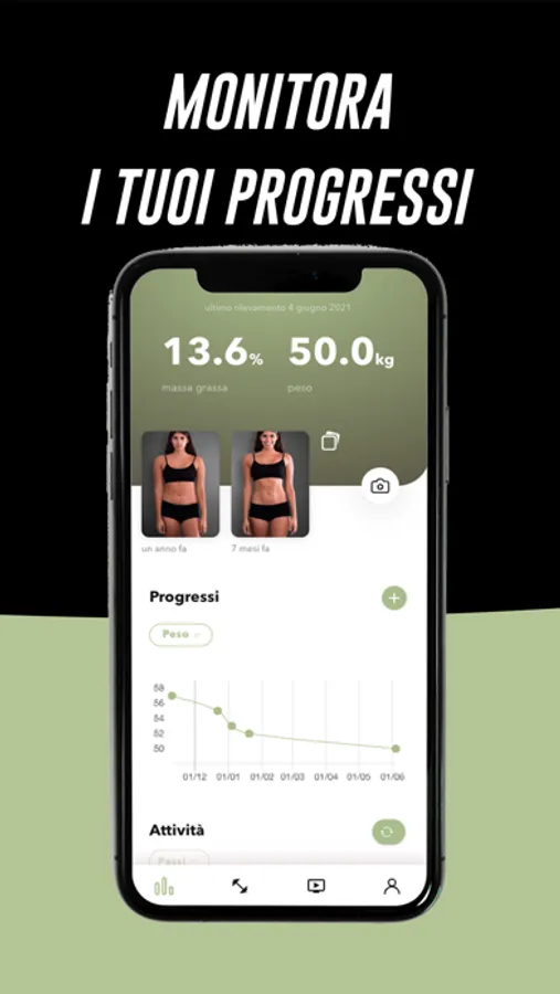 Avrai sempre sotto controllo la tua attività fisica: potrai visualizzare quali esercizi sono previsti nel tuo piano di allenamento, i tuoi progressi e come cambia il tuo fisico nel corso del tempo.