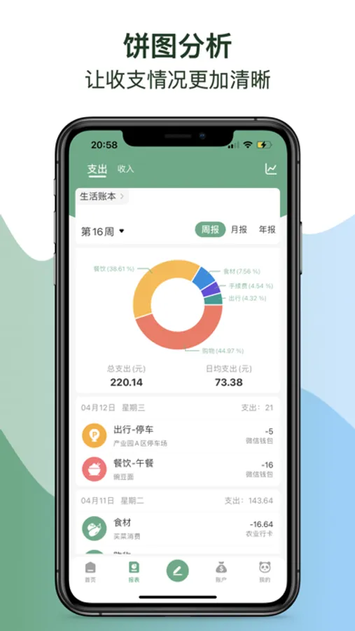 随时查看你的每一笔消费详细记录,知道钱花哪儿了,花销占比大的支出是什么;