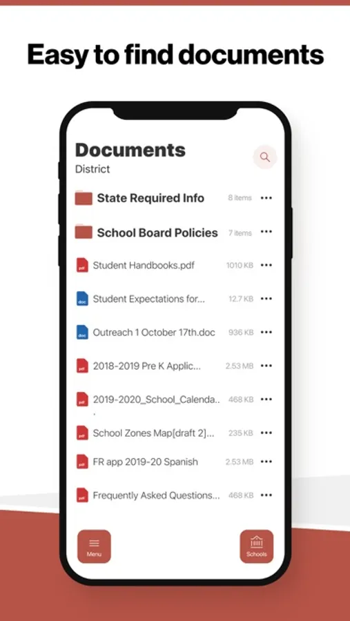 The event section shows a list of events throughout the district. Users can add an event to their calendar to share the event with friends and family with one tap.
