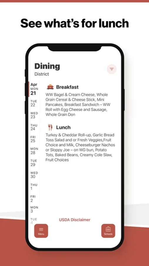 Within the dining section, you'll find an easy to navigate, weekly menu, sorted by day and meal type.