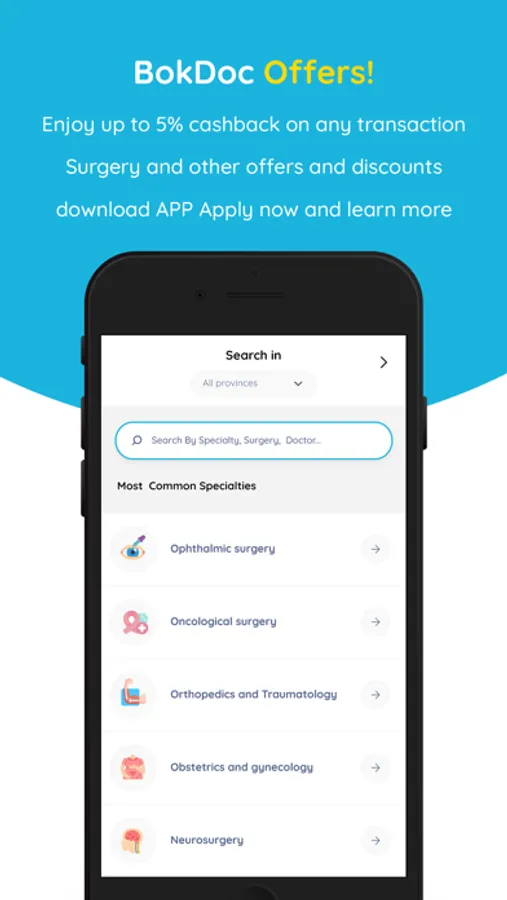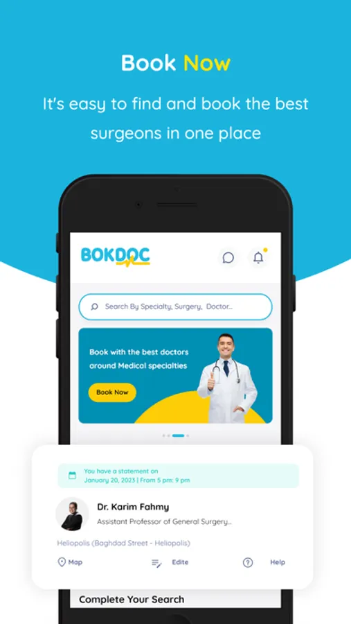 BokDoc is the 1st MARKETPLACE specialized in SURGERIES & MEDICAL PROCEDURES in MENA region, includes more than 37 different Medical specialties, 1500 DRs & 75 Hospitals, More than 3000 surgeries & procedures.