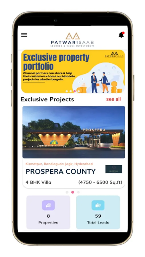 Patwarisaab app exclusively designed for Real estate Channel Partners comes with exclusive mandate projects that can help you grow your business at the click of a tap.