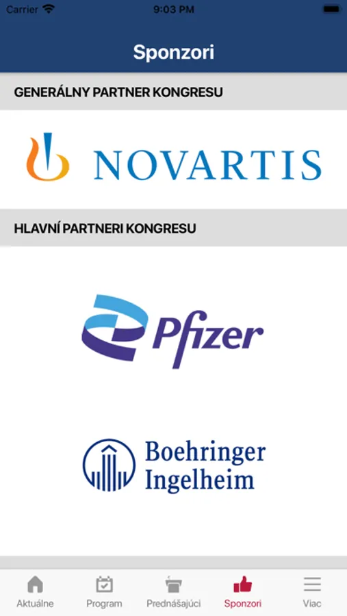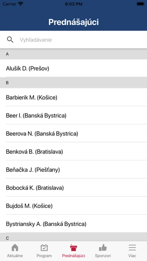 Aplikácia obsahuje aj zoznam prednášajúcich v ktorom je možné vyhľadávať, zoznam sponzorov ako aj zoznam abstraktov ktoré na kongrese odznejú.
