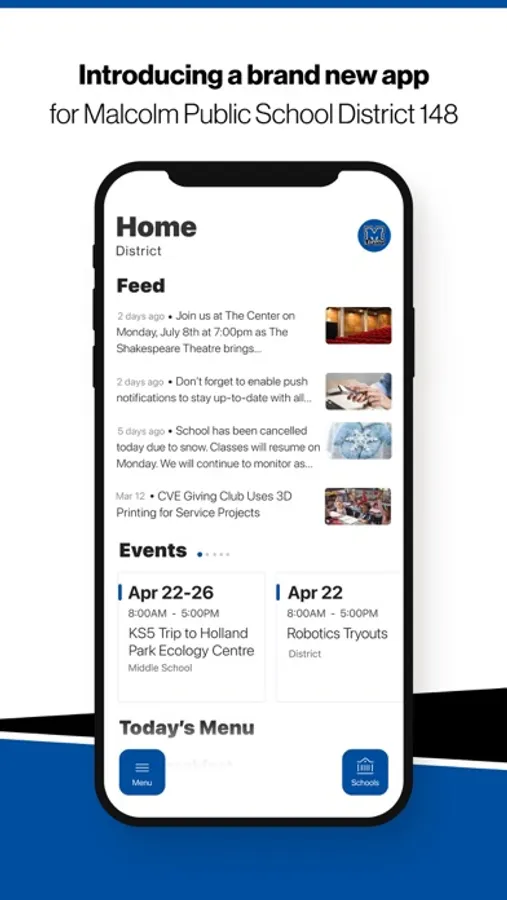 The event section shows a list of events throughout the district. Users can add an event to their calendar to share the event with friends and family with one tap.