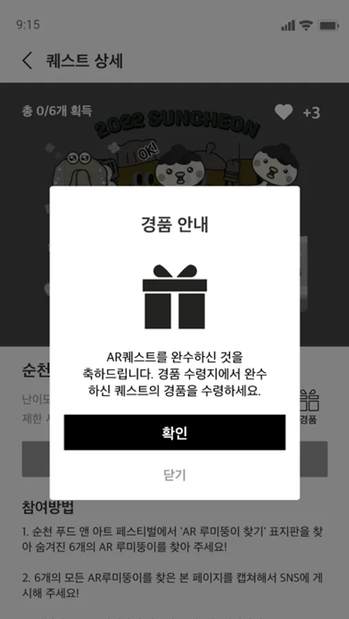 행사장 6곳을 찾아가서 푸드 앤 아트패스티벌 캐릭터 6마리를 AR 게임을 통해서 수집하세요.