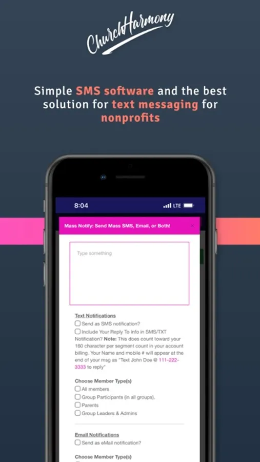 The best solution for text messaging for churches. Blast out mass text updates to your individual member groups or your entire database. Great for praise reports, prayer requests, news, or those quick general updates. Church Texting (SMS. Send out mass SMS texts to your entire membership, or select from a pre-built list of subgroups. Want to just update your admins and group leaders? No prob. Want to update just your parents? No prob. Group SMS Texting. Group leaders can send out mass texts to their group participants within their group admin area, and the notification will only send to that group. Real 2 Way Messaging. Have folks that would like to respond to you? What about when you send out a mass text to 2000 folks and they respond? We got this. You can toggle a setting to automatically include a reply to your name and number number at the end of every text allowing folks to truly communicate back to you individually for any text sent in our system!
