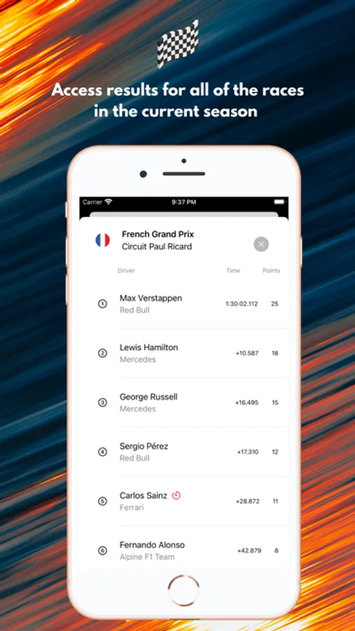 • Results: Current season data including finishing times, points gained, qualifying and sprint results and more.