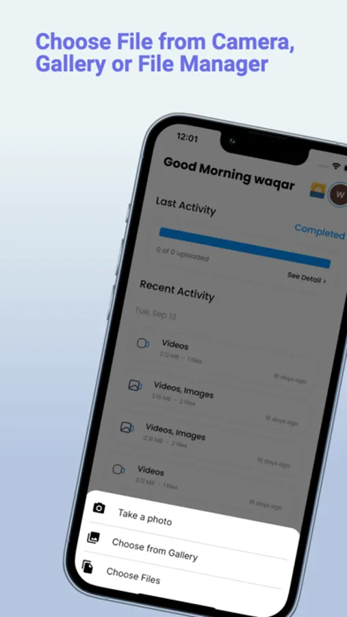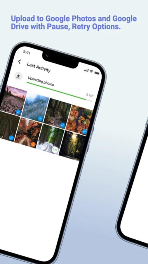 This app allows you to upload photos to google photos and files to google drive. Simply sign in to your google account and begin uploading!