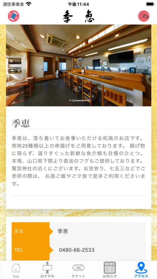 360度パノラマ画像でのお店の内観の閲覧や、お店へのアクセスなどの店舗情報の確認、またお得な情報などの最新のお知らせを確認することができるアプリケーションです。