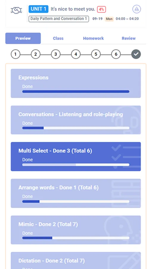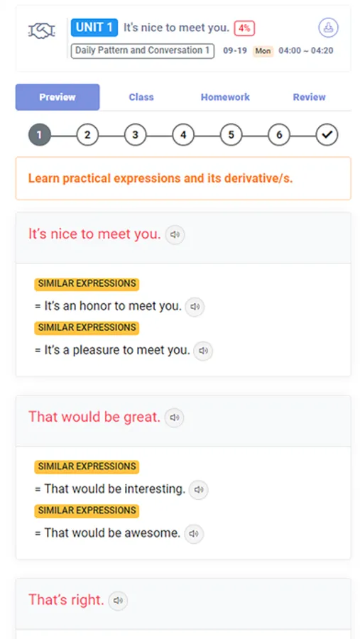 Step 1: Preview, Initial vocabulary and expressions preview.