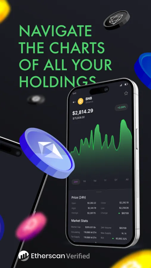 Dione Wallet provides real-time charts of all of your cryptocurrency holdings by simply tapping on the cryptocurrency. Easy and to the point.