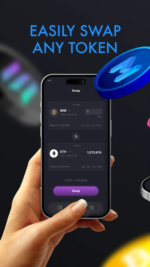 We have implemented the most easy-to-use swap directly on the mobile app, in the palm of your hands, to eliminate all complexity when it comes to figuring out where to buy and sell specific cryptocurrencies. No need for any other platform."