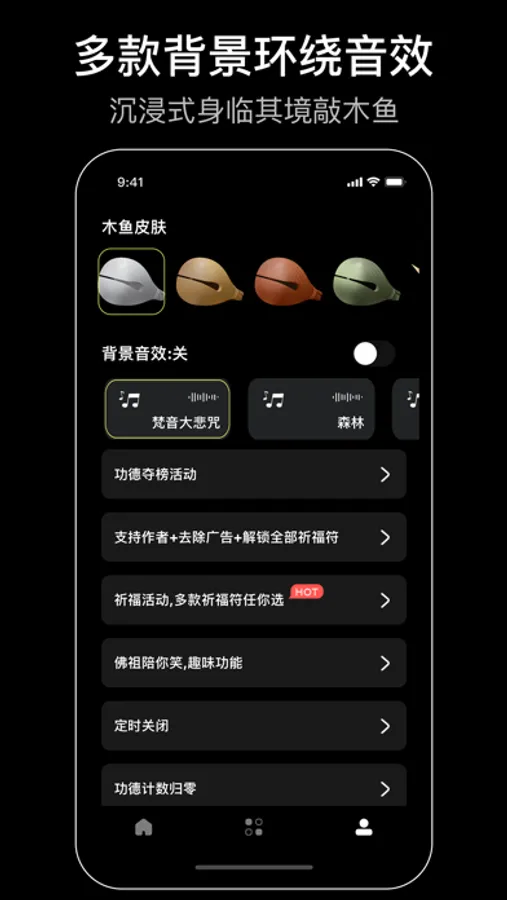 Wooden fish has automatic mode and manual mode, also can change the wooden fish skin, come to download experience.