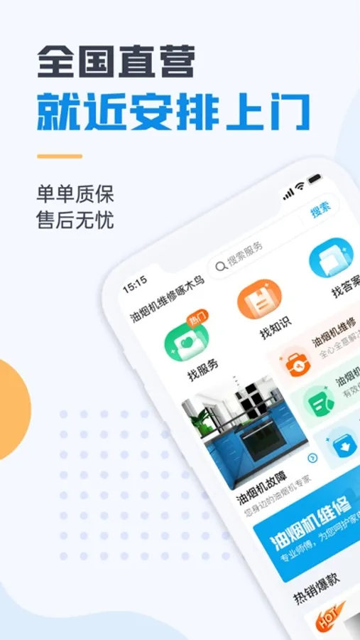 就找油烟机维修app,在线一键预约,5秒快速响应,10分钟内进行派单师傅,10分钟内联系用户,工程师按照与用户约定时间前后30分钟上门,超长质保,修的快,修的好,修的安心,修的放心。