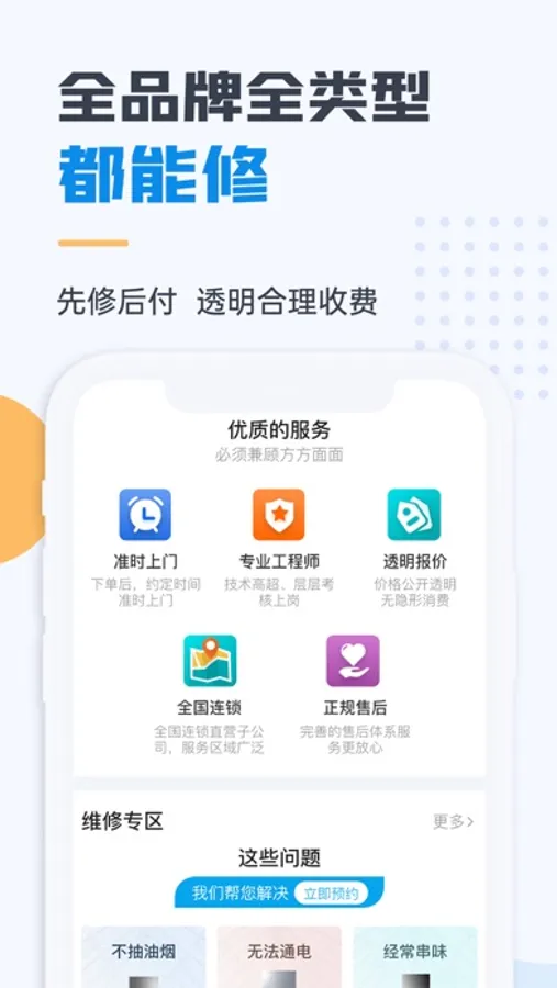【一键预约,快速】用户可通过APP一键预约下单,工程师极速上门维修;