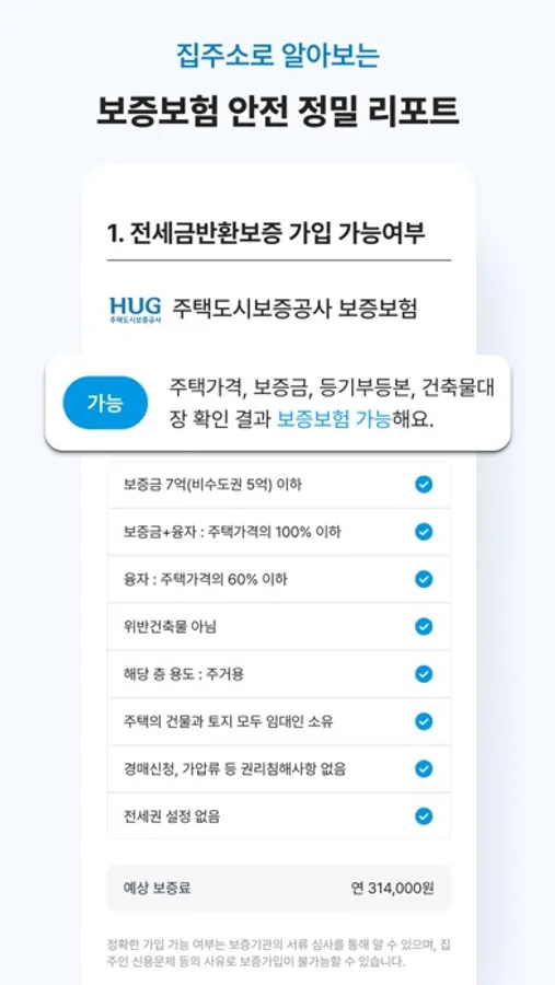 - 등기부등본, 건축물대장, kb시세 분석을 바탕으로 hug 전세금반환보증보험 가입 가능한 집만 볼 수 있어요.