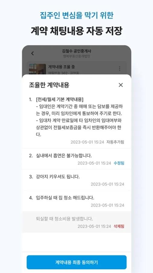 - 중개사님과 채팅한 내용을 자동으로 기록하고 있어요.