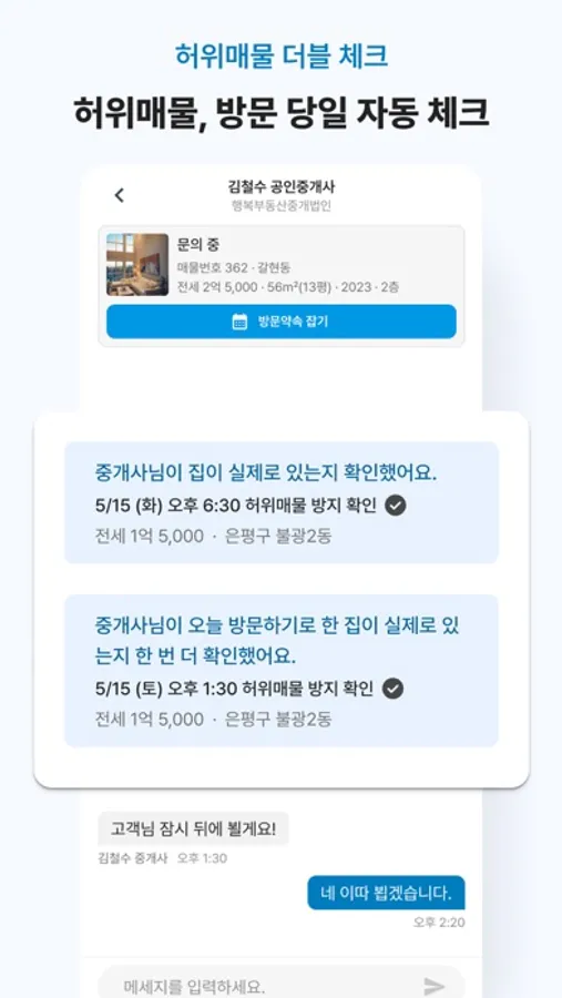 - 집을 직접 보러 가기 전, 방문 당일 두 번에 걸쳐서 매물을 확인하여 허위매물 확률을 낮추고 있어요.