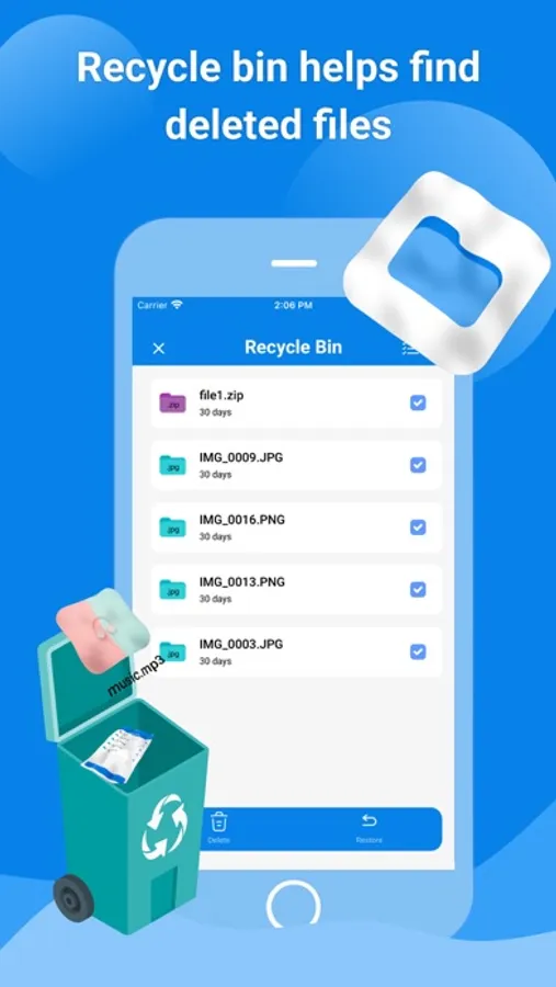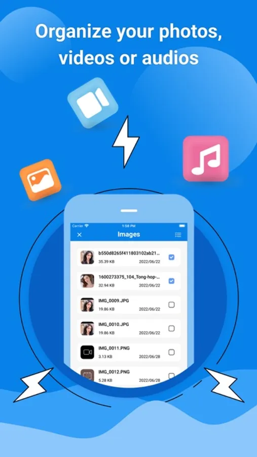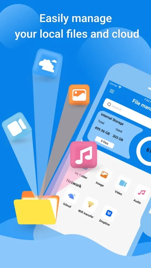 You can easily search any file you want to search. We also categorize file search. You can quickly filter files in categories, including images, music and videos