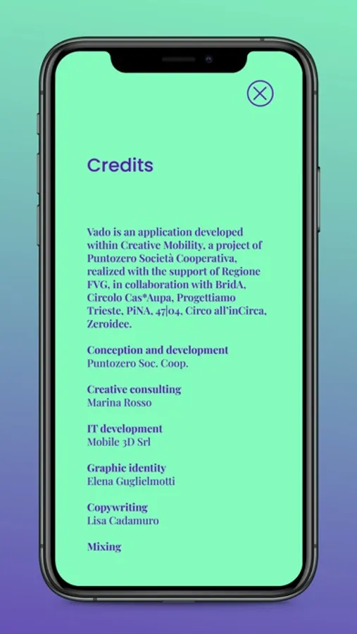 Vado is realised by Puntozero Società Cooperativa within the project Creative Mobility, with the support of Regione Friuli-Venezia Giulia. The ideation and development are by Puntozero Società Cooperativa, with the creative consultancy of Marina Rosso, digital development by Mobile 3D srl.