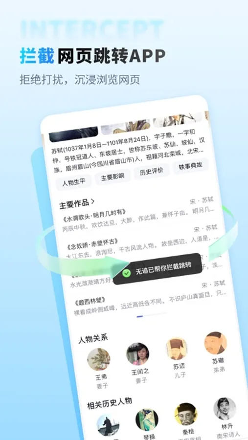 当您在搜索点击网页上某条结果时会自动跳转到对应的APP或者进入APP下载页面,可能会打扰您的搜索体验。无追提供拦截网页自动跳转APP的功能,您可以根据搜索场景自行选择开启或关闭此功能。