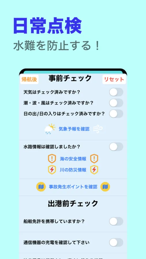 ・出港前/帰航後の点検リストで安全をサポートします。
