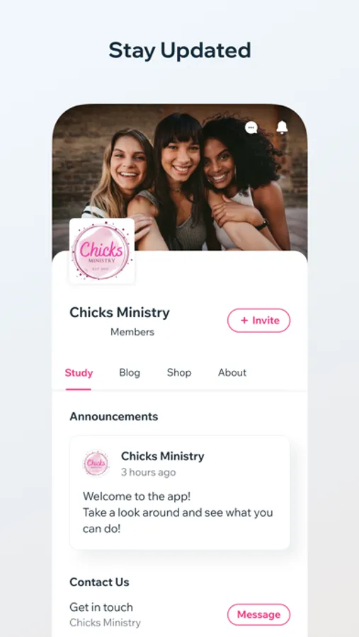 Study Tab: This is where you can find what you need to study the Bible along with us. Click the Button at the top of the App to purchase your simple bible study. Then use the app for journal tips and ideas to help to connect with God. Posts include Reel clips, deep thoughts, questions, and more that will get you thinking. Chicks Ministry is on TikTok, Instagram, & Facebook, some of the same content is there.