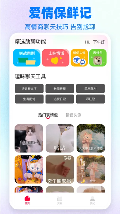 爱情保鲜记是一款助您如何高情商与异性聊天恋爱的app,恋爱脱单神器,情感知识学习平台,收录超全聊天精选教程,集合恋爱实战案例、星座配对、语音转文字、土味情话等使用助聊工具。尬聊有何技巧?不会聊天总冷场,快来下载爱情保鲜记,帮助您提升聊天思维解决恋爱聊天问题!快速追到自己喜欢的TA!