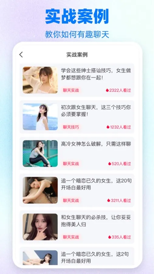 2万+恋爱实战:丰富恋爱聊天案例随意查阅,吸取前人经验,让您少走恋爱弯路。