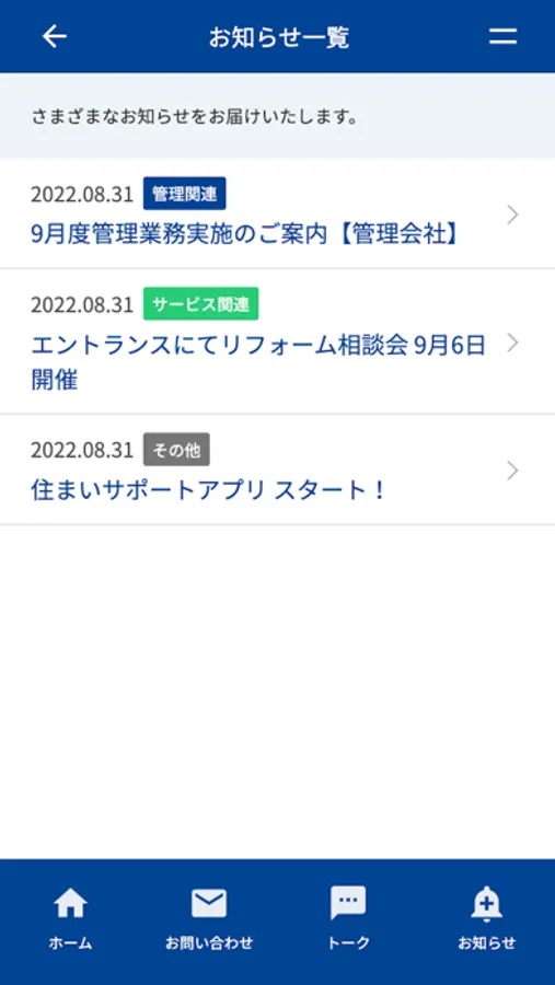 マンションの管理に関するお知らせや、アプリ限定特典のキャンペーン情報などを定期的にお届けいたします。