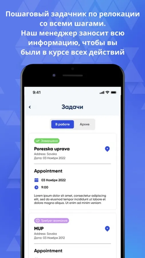 Перед вами первое на Балканах приложение по релокации бизнеса и получения ВНЖ. GoBalkans выпускает трекер задач и менеджер контактов, который обеспечит легкую эмиграцию на Балканы. Благодаря приложению наши клиенты видят все предстоящие задачи и подписания документов, контакты бухгалтера, юриста, переводчика, адвоката и конечно персонального менеджера. С нашим приложением Вы занимаетесь тем что важно вам без отрыва на бумажку волокита, а наши специалисты обеспечивают комфортный переезд.