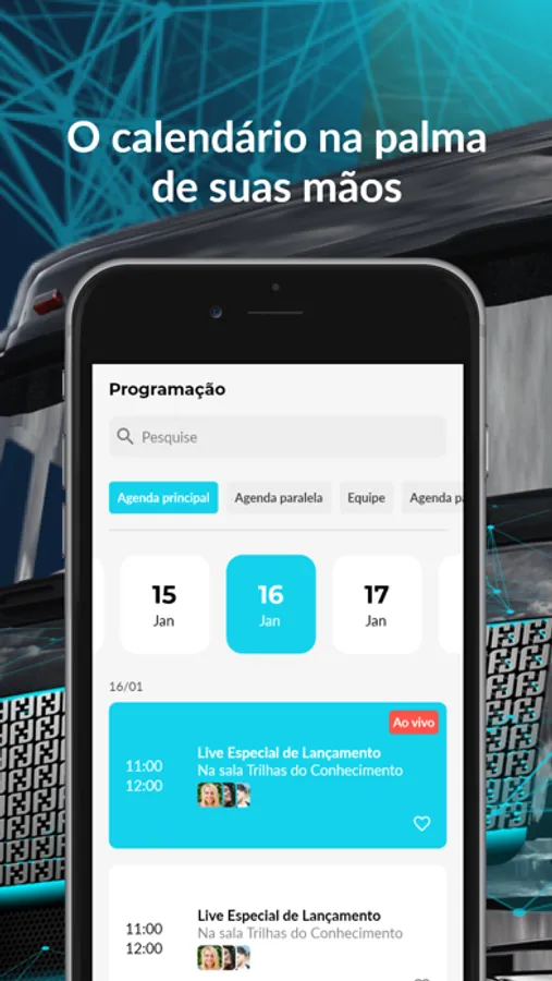 Com o aplicativo da FENATRAN, você tem acesso a uma rede exclusiva de contatos, podendo trocar mensagens com expositores e outros participantes e interagir com toda a comunidade da feira. Além disso, você pode consultar toda a programação destes 5 dias de realização. Utilize o APP e aproveite ao máximo os recursos.