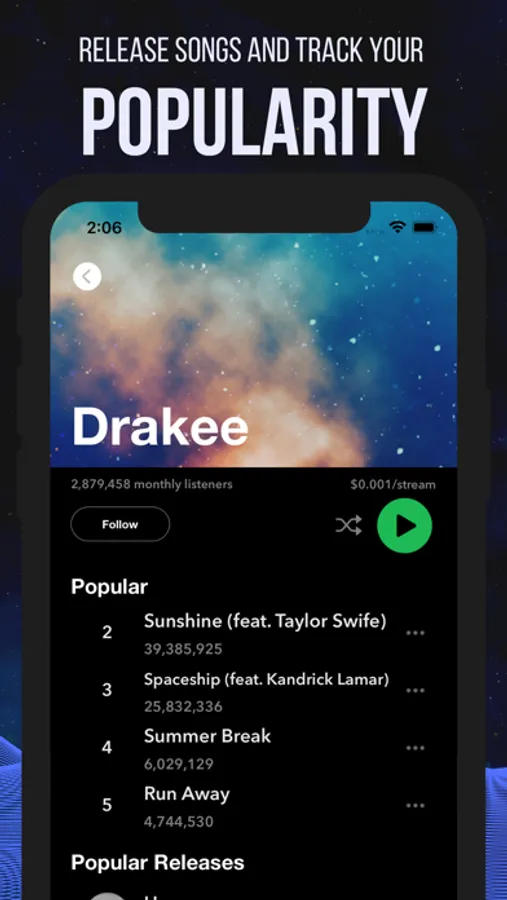 Grow your monthly listeners, create concept music videos or release official lyric videos. Gain followers, listeners, subscribers and earn royalties on streams, music video views and become the most popular artist in the world!