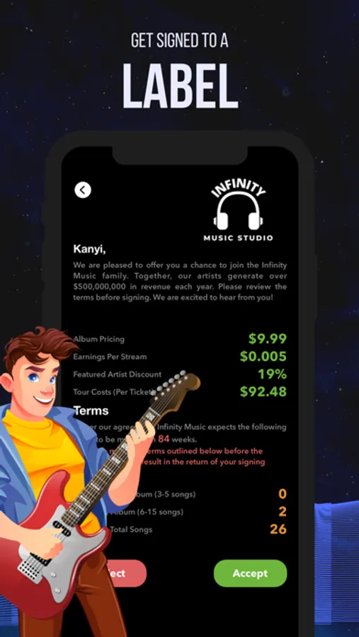 Start your own record label, sign new talent, hire the right team, review song lists and drop artists that aren't performing!