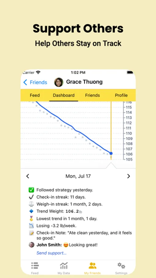 Losing weight is really hard. Doing it with the support of friends helps significantly. It feels less scary, less lonely, and can even be fun. Also, having someone else look at your weight has a profound psychological effect. You'll notice that the more other people are watching your weight graph, the more it will tend toward your goal weight.