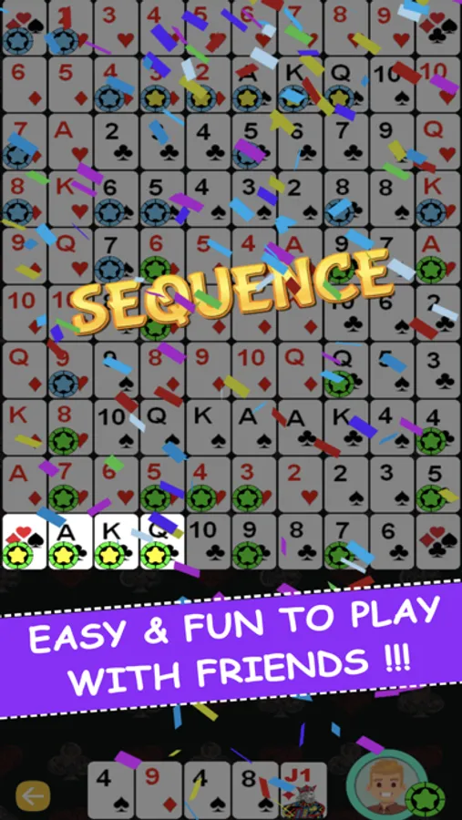 A SEQUENCE is a connected series of five of the same colour poker chip in a straight line, either up and down, across or diagonally on the playing board.