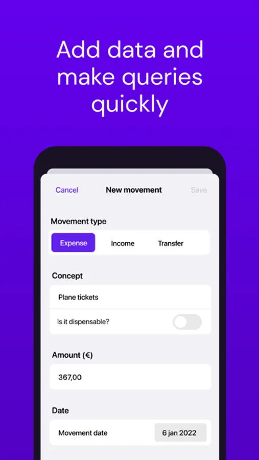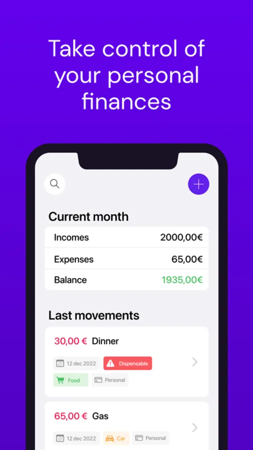 By organizing your income and expenses into accounts and categories, you will obtain detailed information and charts to analyze your finances.