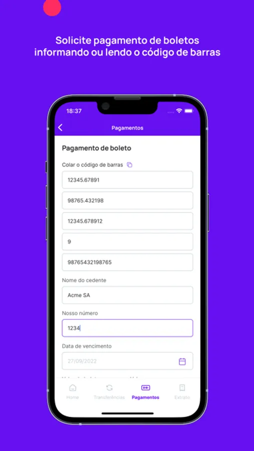 Solicite transferências e pagamento de boletos pelo app, além de acompanhar o histórico de transações realizadas ao longo do tempo.