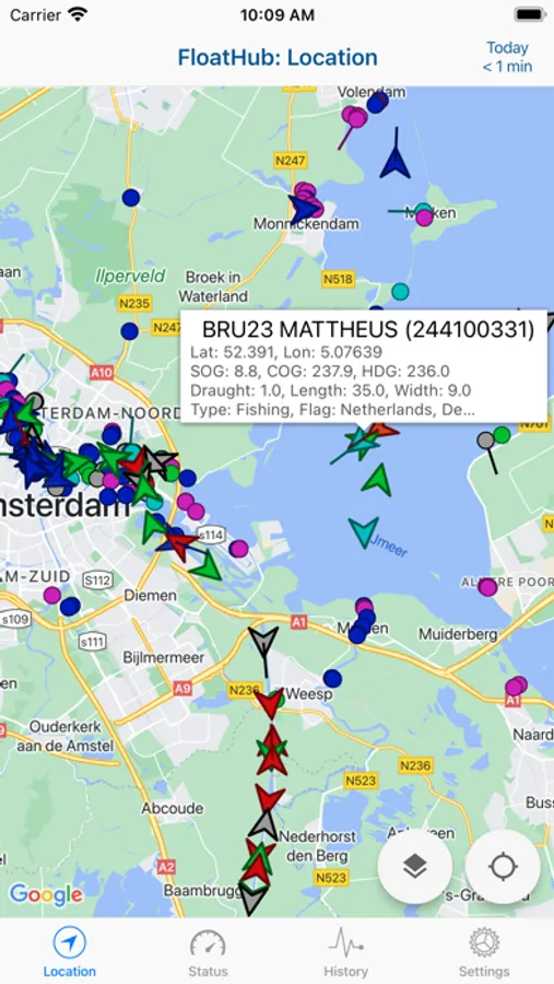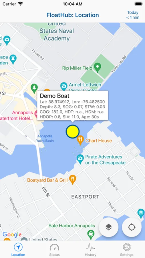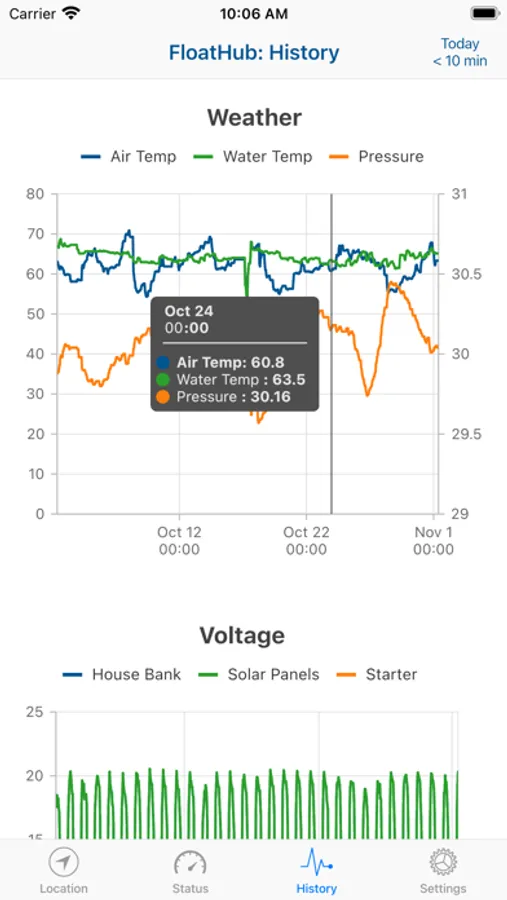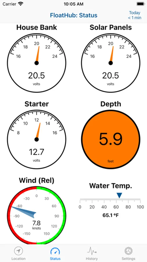 The FloatHub app currently lets you see the location and status of your vessel, publicly available data about vessels in your vicinity, and a recent history of your vessels systems (voltages, speed, depth, etc.).