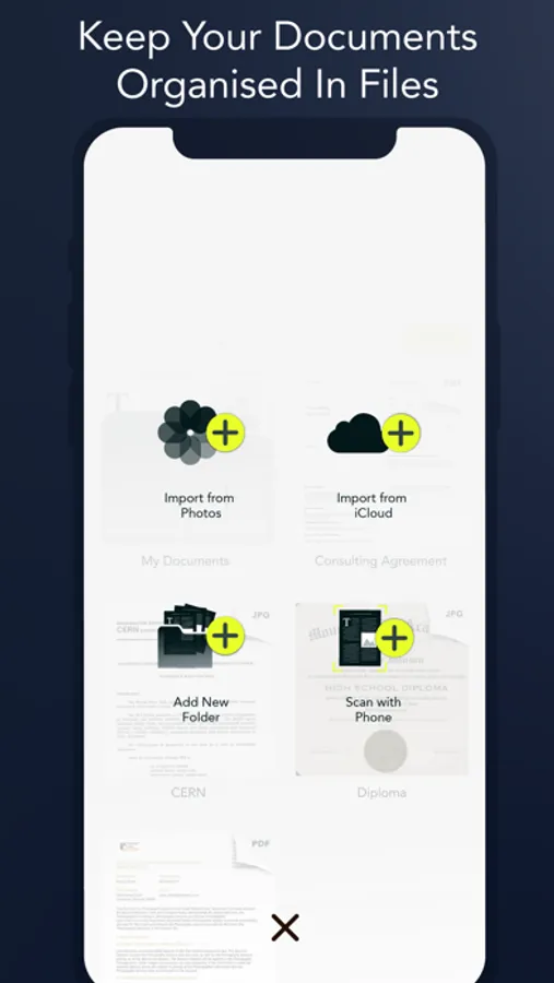 - Click the + button on the main page of the app, you will find options to import from photos, cloud import from cloud, scan with phone.