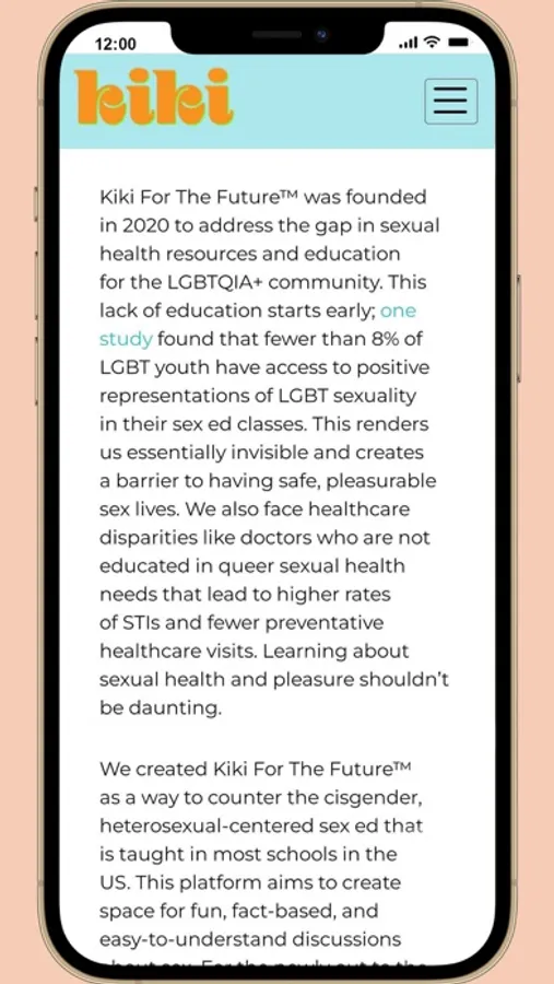 Kiki For The Future™ is an app that curates sexual health resources for the queer community. We are a platform for queer sexual education, for sexual liberation, for knowledge, for power, joy, freedom, and connection.