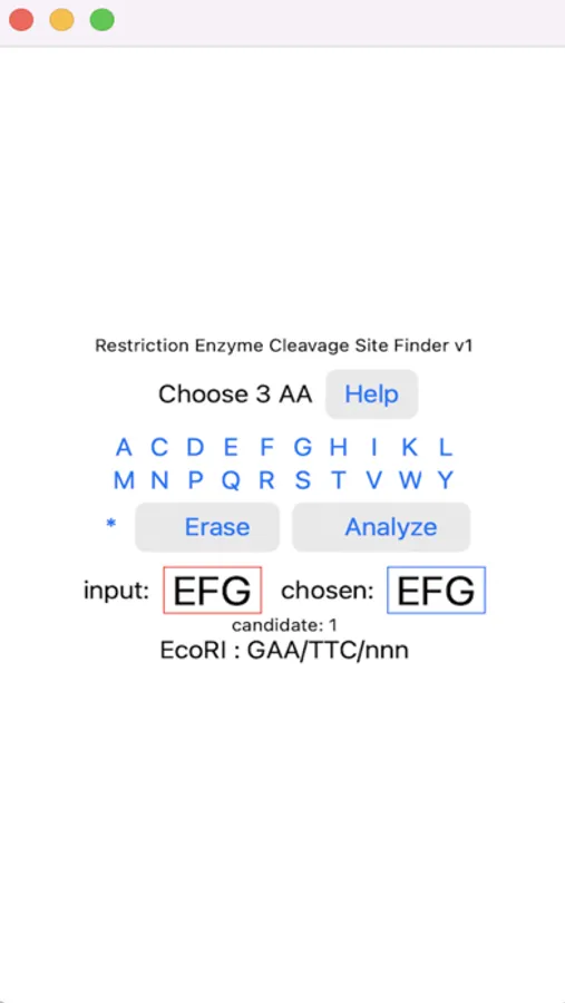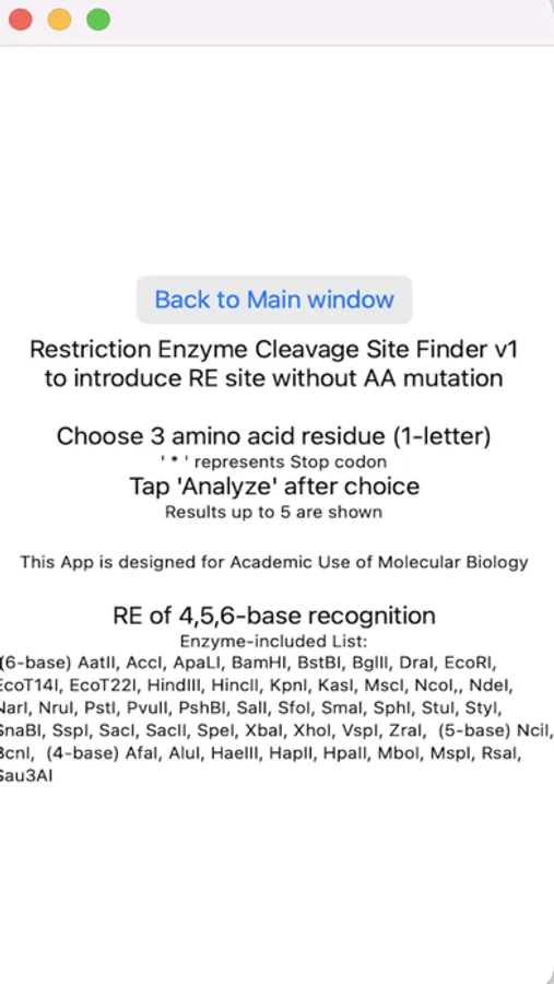 This App is designed to help Researchers and University Students who are involved in Molecular Biology Research. This App can search the possible cleavage site position for "restriction enzymes" (just a name of a group of enzymes, not containing a meaning of "restriction") in amino acid sequence, not in nucleotide sequence. For examples, the enzyme "EcoRI", recognizing "GAATTC" nucleotide sequence, whose cleavage nucleotide sequence corresponds to amino acid sequence "EF"-containing residues or "LNS"-containing residues. The base sequence for the Enzymes for 4~6 base recognition corresponds to two or three amino acid residues, so this App will help you to find the base-mutation candidates in the certain amino acid sequence for base mutation design, PCR primers design, and so on. For example, when you input "EFG" or "LNS", this App will show you "EcoRI" enzyme with the cleavage positions.