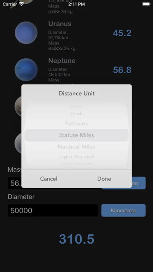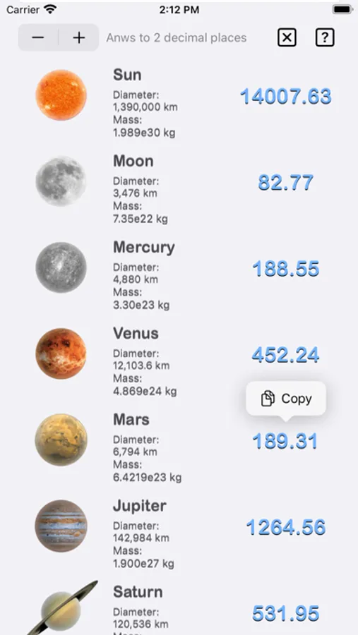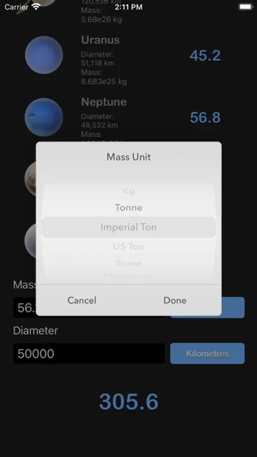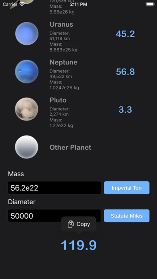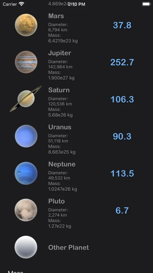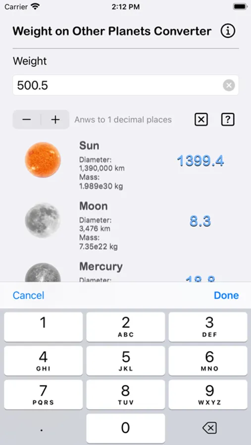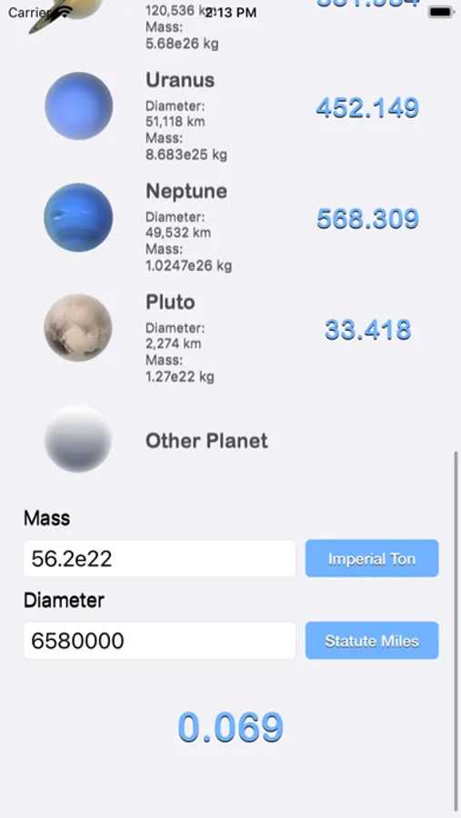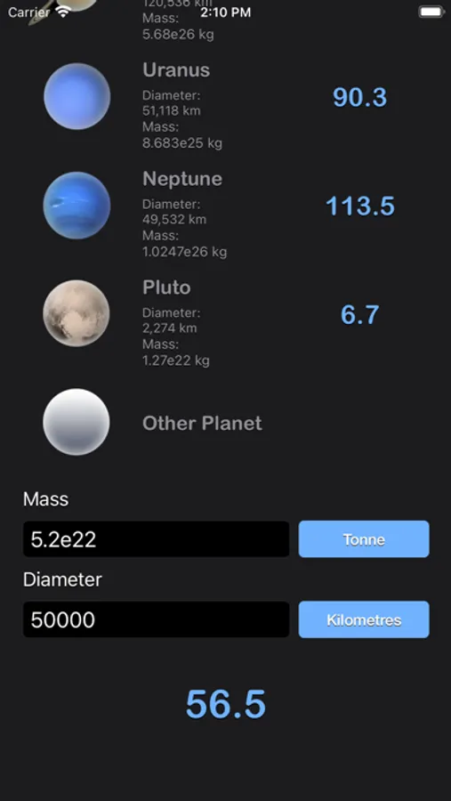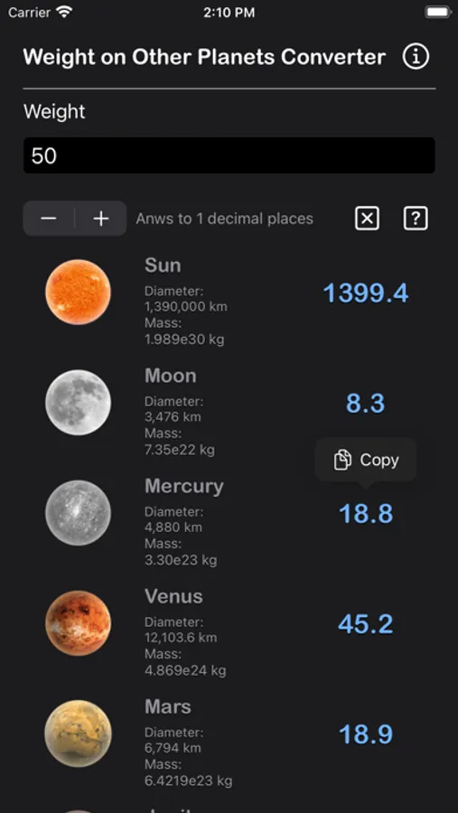 Your weight is different on other planets in the Solar System because the gravity is different. This converter tells you what the scales would read on other worlds. The units will be the same on the other planet. e.g if the input is 50 kg on Earth the answer given would be in kg on any of the other planets.