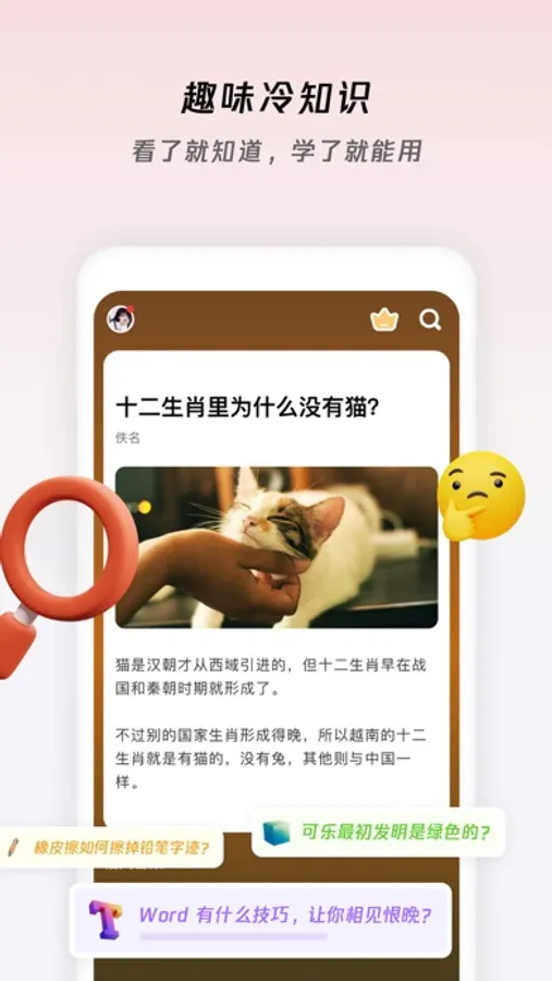 冷知识酱,是一款帮你利用碎片时间,快速、高效了解奇奇怪怪知识点的轻阅读应用。这里的文字无废话、不套路,在确保内容信息量的基础上,我们最大限度地控制篇幅,确保每一篇你都能看得完,学得会,做你身边最务实的闲时读物。