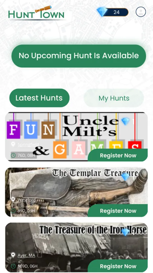 Hunt Town is a mobile puzzle game. Each “hunt” is a series of puzzles in a story format, with the solution of each puzzle leads to the next puzzle story or hunt. The first person to solve each hunt will be awarded the cash prize and a badge. Subsequent players will be rewarded with the diamonds and badges