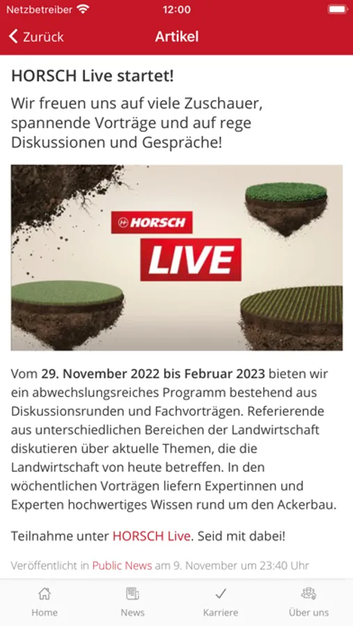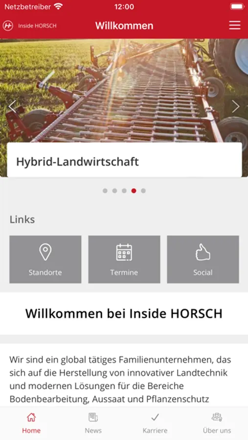Inside HORSCH als zentrale Informations- und Kommunikations-App von HORSCH bietet neben den aktuellen Neuigkeiten und Social-Media-Feeds auch allgemeine Informationen zum Unternehmen, eine Übersicht über unsere Standorte und einen Eventkalender. Erhalte einen Einblick hinter die Kulissen und erfahre alles über HORSCH als Arbeitgeber sowie die Karrieremöglichkeiten bei uns. Mit Inside HORSCH bist Du rund um die Uhr auf dem Laufenden und hast alle Informationen schnell und mobil zur Hand! Push-Benachrichtigungen helfen Dir dabei, nichts mehr zu verpassen. Sind noch Fragen offen? Dann melde Dich bei uns