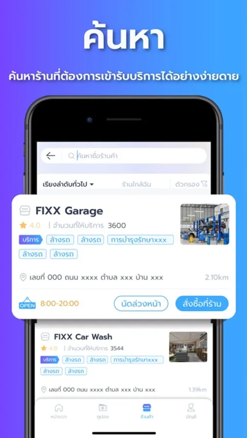 ฟังก์ชันค้นหา : สามารถค้นหาอู่ซ่อมรถใกล้คุณ ตรวจสอบการให้บริการจากรีวิวของผู้ใช้งานจริง และ ดูภาพหน้าร้านก่อนตัดสินใจเข้ารับบริการ
