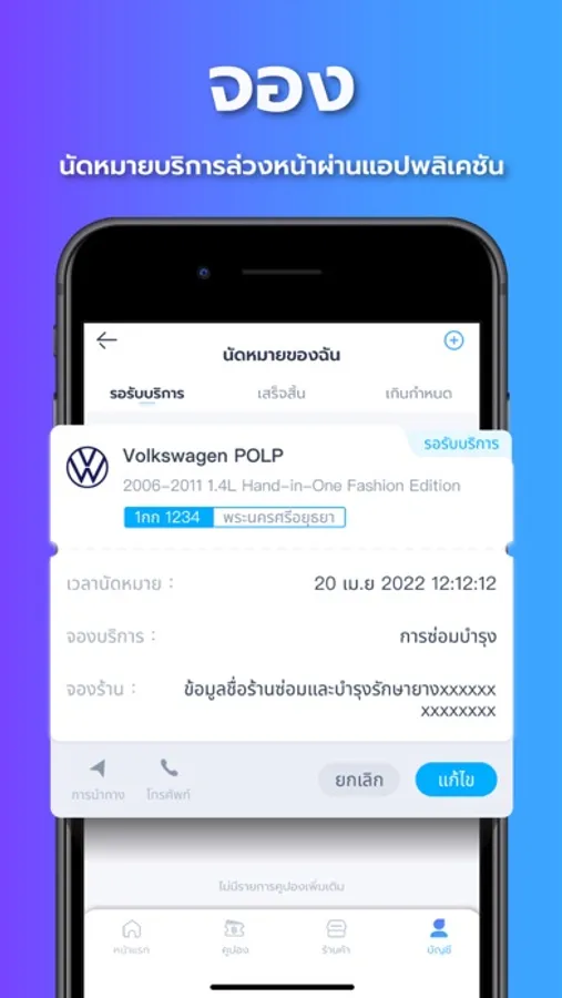 ฟังก์ชันนัดหมาย : ก่อนเข้ารับบริการ คุณสามารถนัดหมายเวลากับอู่ผู้ให้บริการ เพื่อความสะดวกในการวางแผนการเดินทางของคุณ