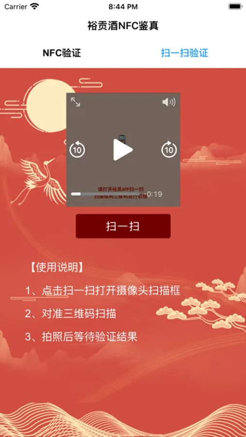 *碰一碰*:通过调用手机NFC功能,将手机NFC识别区域轻靠NFC芯片位置,获取当前酒类的防伪信息及开瓶信息;